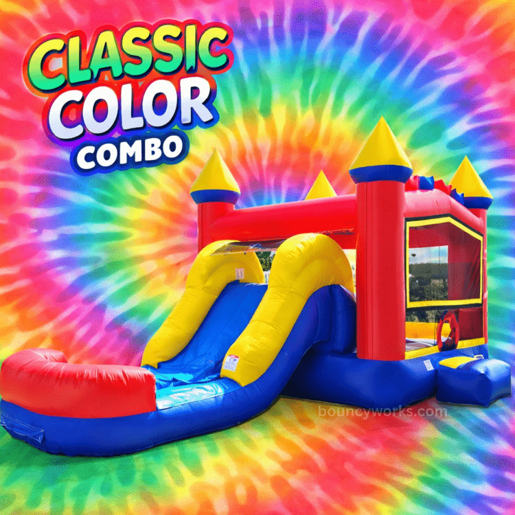 The Classic Color Combo delivers nonstop fun and flexible play—wet or dry. This all-in-one inflatable features a spacious bounce area, climb wall, built-in basketball hoop (basketball not included), and a slide that can be used dry or converted to water fun.