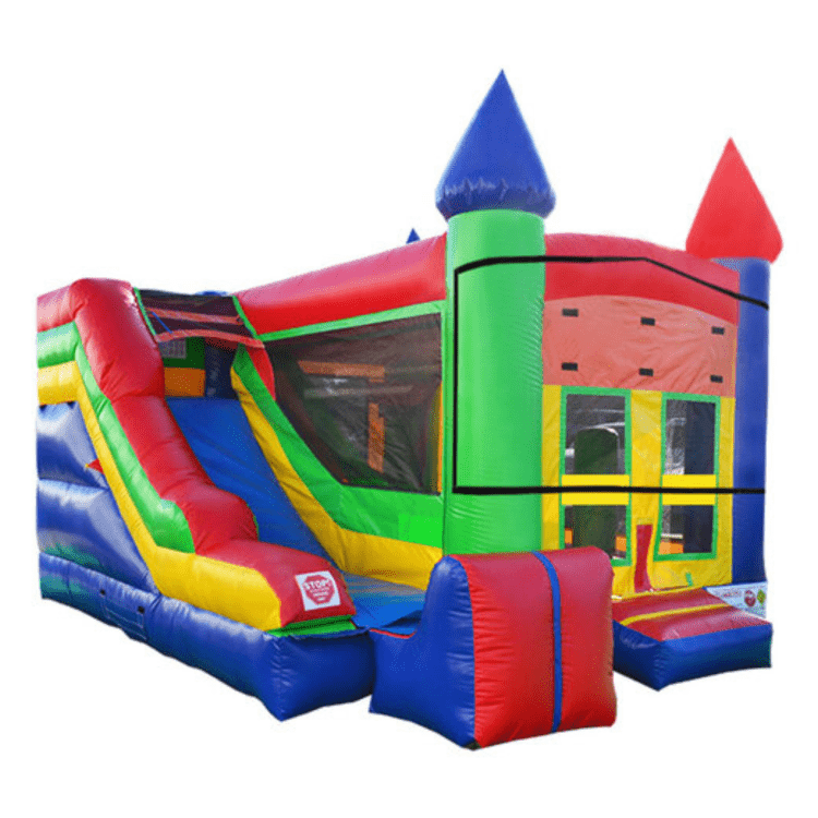 A vibrant 13' x 20' combo jumper designed for big fun in compact spaces. This front-slide combo keeps all play facing forward so you can easily supervise the bounce area and slide from one spot. Kids can bounce, weave through the built-in pop-ups, shoot hoops with the built-in basketball hoop (balls not included), climb the interior climbing steps, and slide down into a soft inflatable landing bumper. A perfect choice for birthdays, school events, and community gatherings.