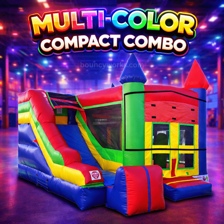 The Multi-Color Compact Combo delivers big fun in a space-friendly design—wet or dry. Measuring 13' x 20', this vibrant combo keeps all play facing forward, making it easy to supervise both the bounce area and slide from one spot.