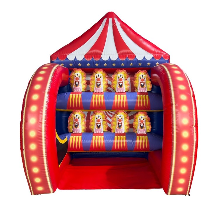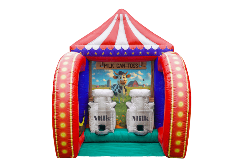 Create a full carnival midway with the Ultimate Carnival Games 4-Pack Bundle! This set includes Milk Toss, Down-a-Clown, Ring Toss, and Foam Darts—linked together and powered by one blower. Each game stands 10 ft tall and measures 8' x 8', forming a bright, eye-catching 32-ft carnival row perfect for schools, churches, and community events.