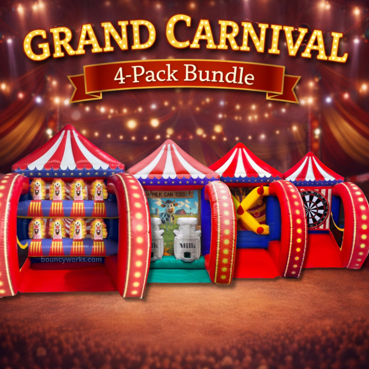 Create a full carnival midway with the Grand Carnival 4-Pack Bundle! This set includes Milk Can Toss, Down-a-Clown, Ring Toss, and Foam Darts—linked together and powered by one blower. Each game stands 10 ft tall and measures 8' x 8', forming a bright, eye-catching 32-ft carnival row perfect for schools, churches, and community events.