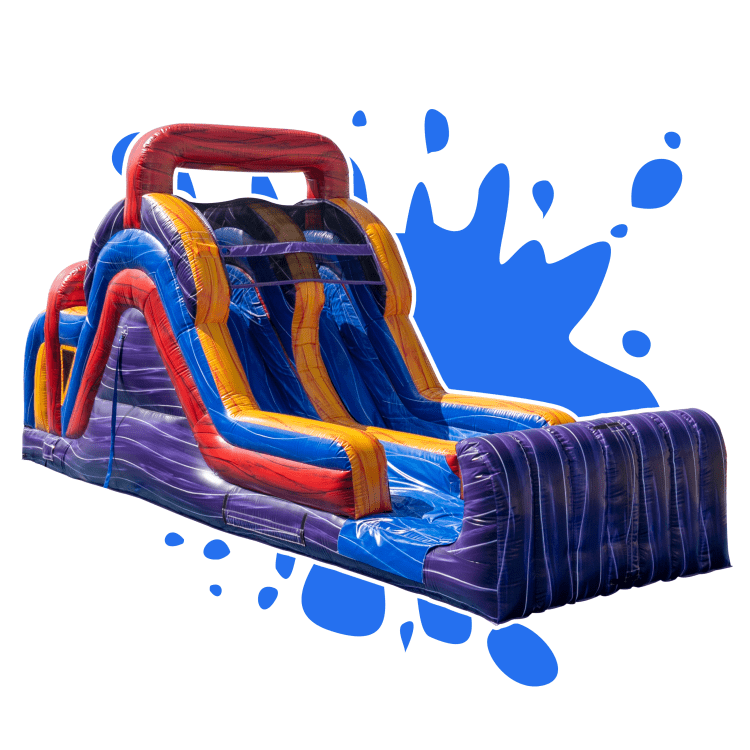 The 14ft Mega Marble Dual Lane Water Slide delivers fast, refreshing fun for any event. Kids enter through the enclosed safety tunnel, climb the rear-loading wall, and head down the two-lane water slide into an inflated splash pad landing. The built-in water drip system keeps the slide wet for a fun, refreshing experience. Perfect for backyard parties, school events, and community celebrations.