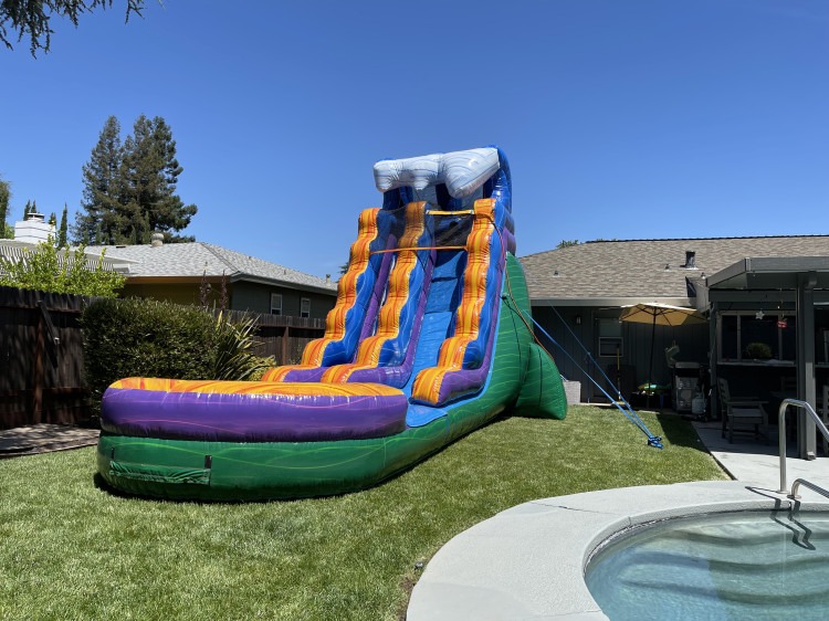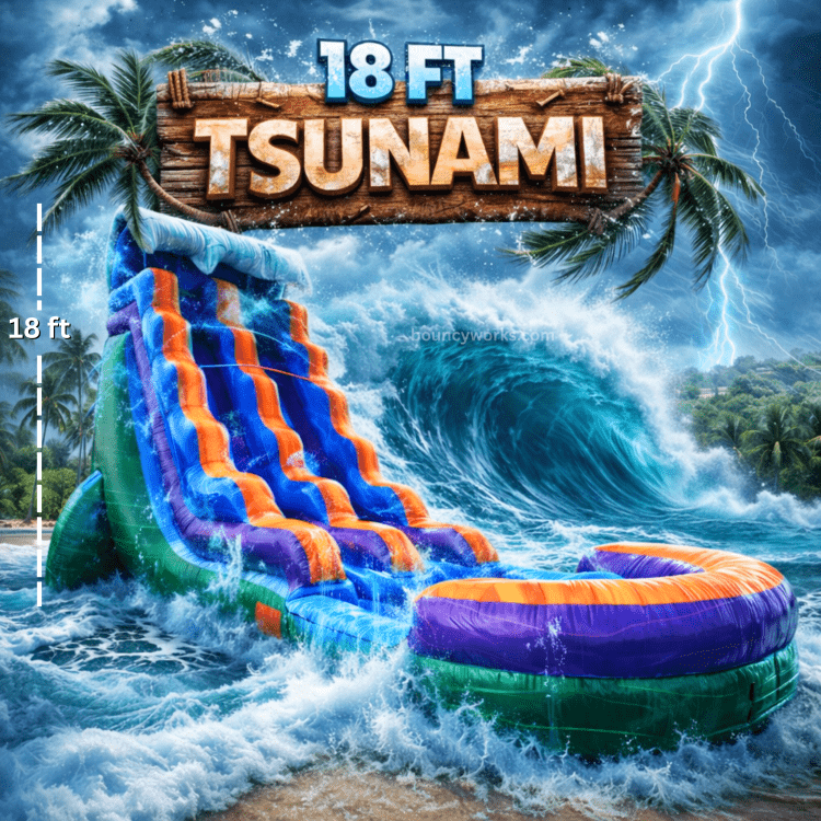 The 18 ft Tsunami Water Slide is a tall, exciting single-lane slide designed for ages 5+. Riders climb up and enjoy a fun, fast drop down the slide before splashing into the large splash pool. Its bold Tsunami colors make it a perfect attraction for birthdays, schools, churches, and backyard parties.