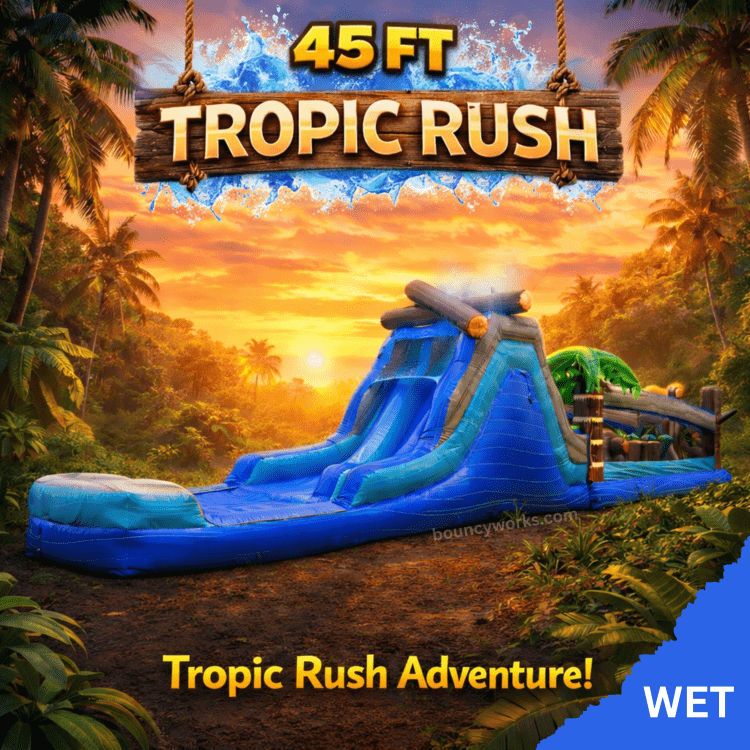 The 45 ft Tropic Rush Obstacle Course (Wet) delivers nonstop excitement with tropical climbs, pop-ups, squeeze-through challenges, and a fast dual-lane water slide packed into 45 feet of splash-filled fun. Players race side-by-side through each obstacle before finishing with a refreshing slide into the splash-pool landing.